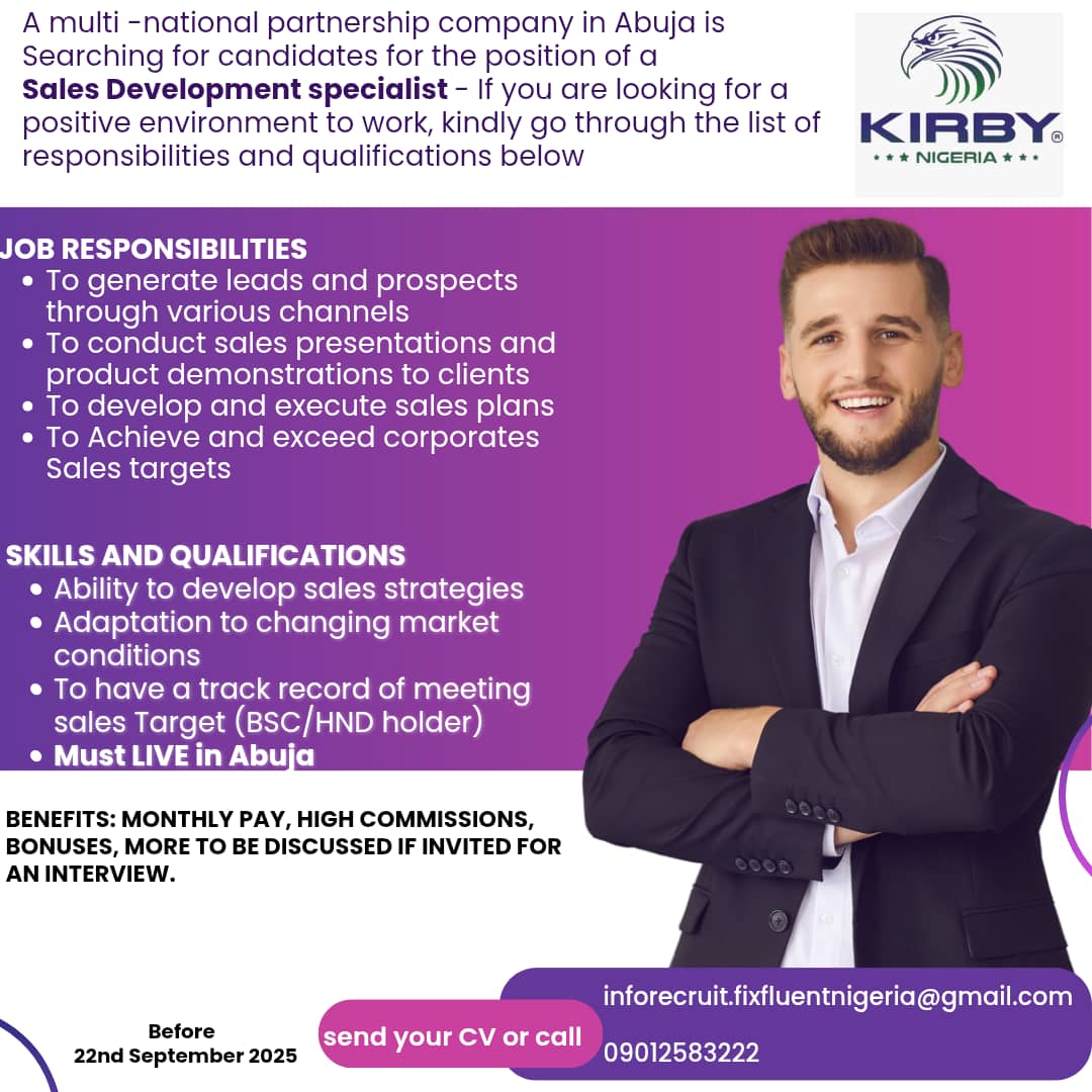 A multi- national partnership company in Abuja is searching for candidates for the position of a Sales Development Specialist..